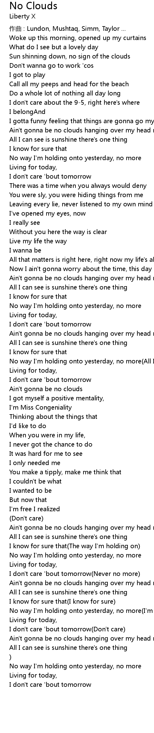 | Ain' t gonna be no clouds hanging over my head no more Gon' be no clouds | |