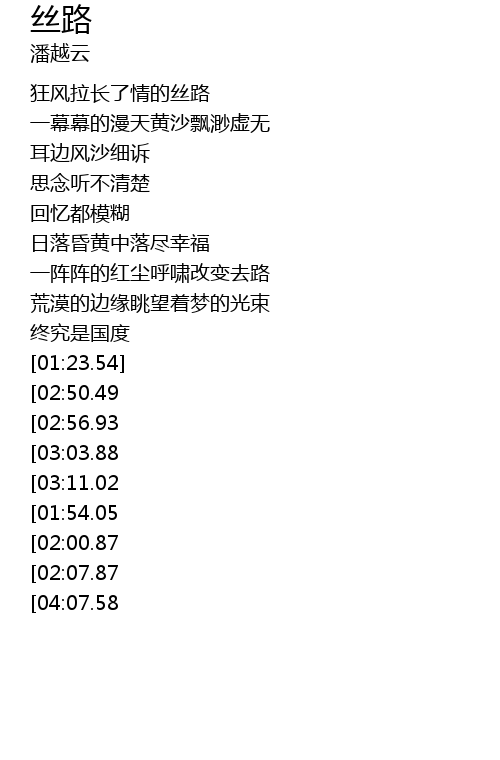 | [04:00.60][02:07.87] | 漂泊的丝路 有我一颗颗泪珠 |
