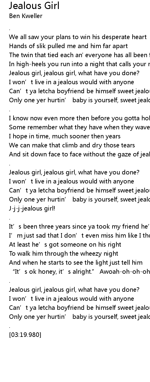 | [01:59.900] | Can' t ya letcha boyfriend be himself sweet jealous girl, oh jealous girl? |