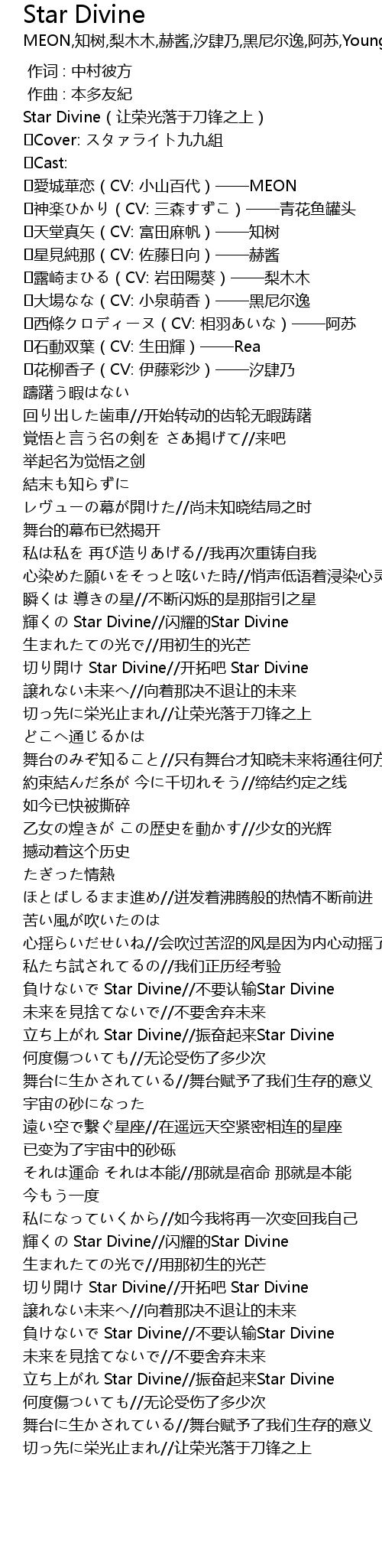 | [00:49.794] | 輝くの Star Divine//闪耀的Star Divine |