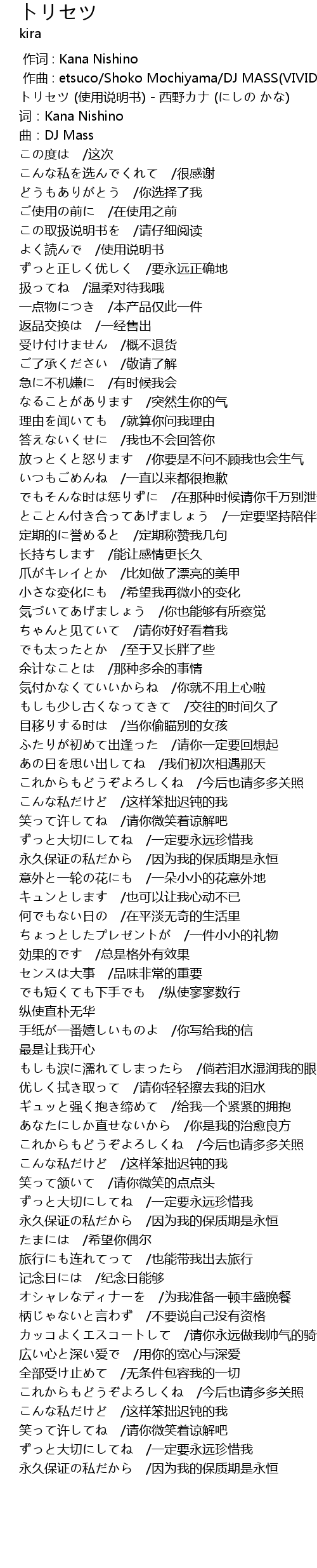 | [00:02.709] | トリセツ (使用说明书) - 西野カナ (にしの かな) |