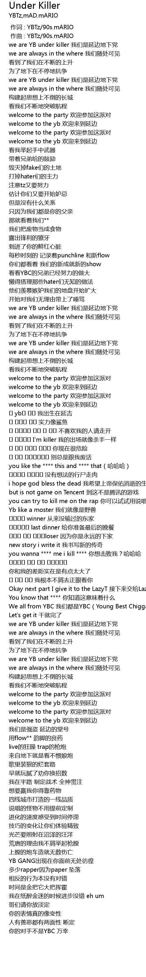 | [01:49.104] | we are YB under killer wǒ men shì yán biān dì xià dǎng |
