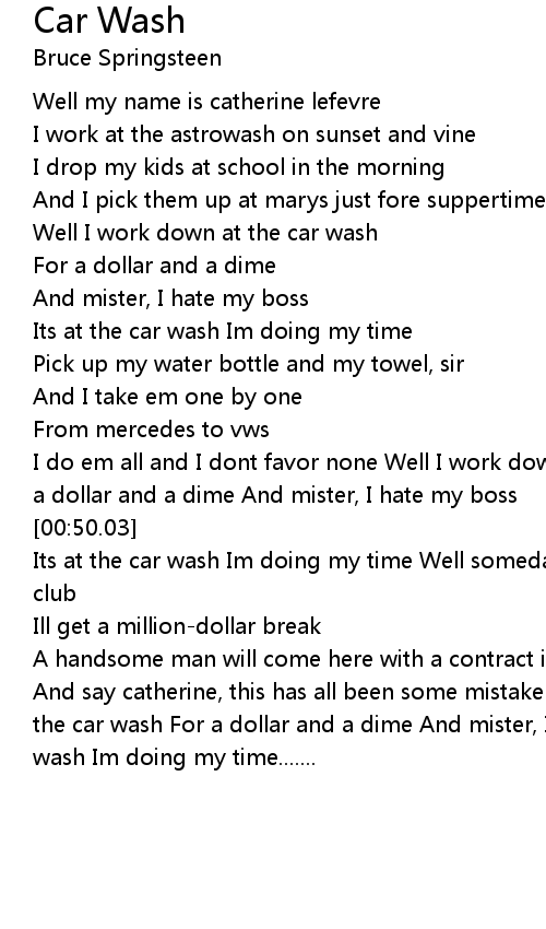 And say catherine, this has all been some mistake Well I work down at the car wash For a dollar and a dime And mister, I hate my boss Its at the car wash Im doing my time....... |