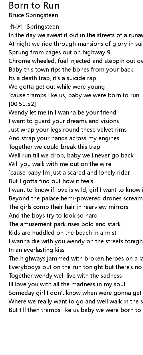 | [00:47.57] | cause tramps like us, baby we were born to run |