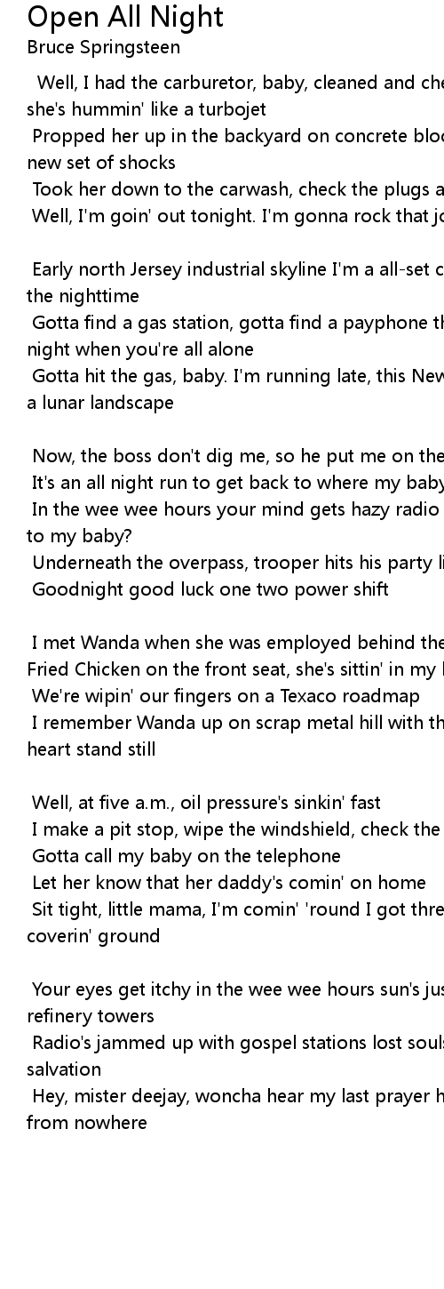 Gotta find a gas station, gotta find a payphone this turnpike sure is spooky at night when you're all alone |