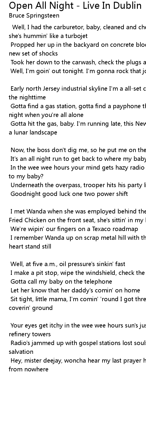 Gotta find a gas station, gotta find a payphone this turnpike sure is spooky at night when you're all alone |