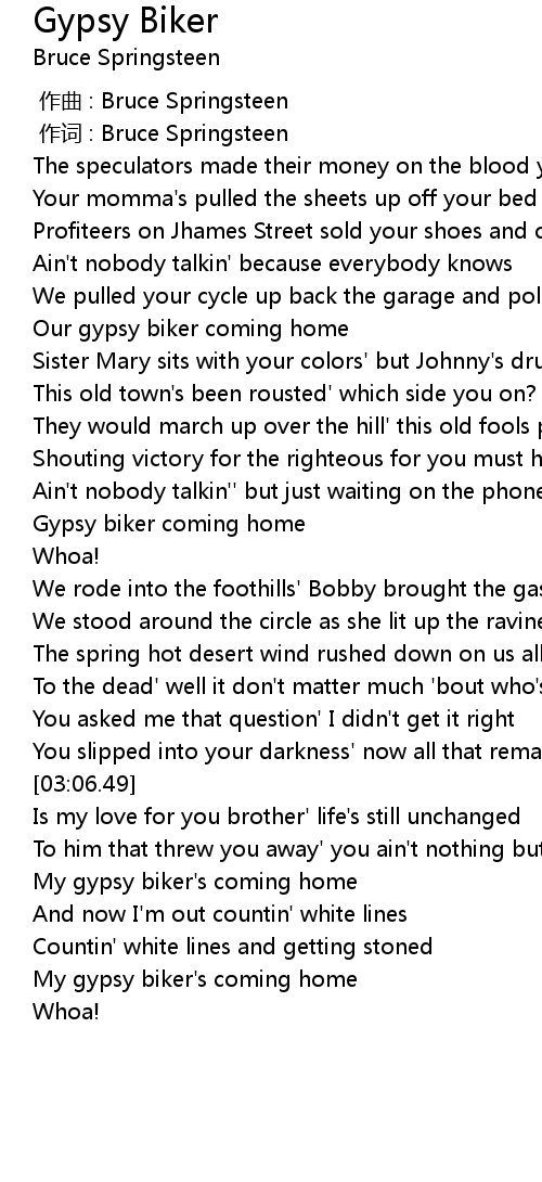 | [00:53.74] | Our gypsy biker coming home |