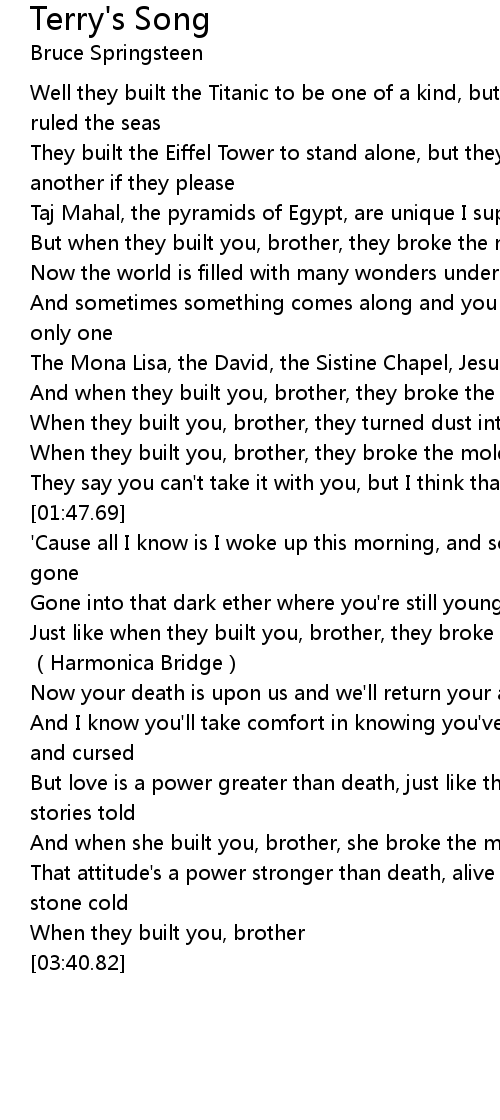 | [01:16.69] | And when they built you, brother, they broke the mold |