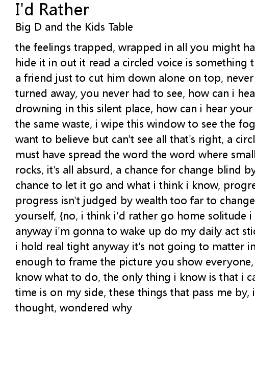 | the feelings trapped, wrapped in all you might have said i want to take it back, hide it in out it read a circled voice is something that i cannot stop why have a friend just to cut him down alone on top, never fought, never mean, you never turned away, you never had to see, how can i hear your screams when you' re drowning in this silent place, how can i hear your screams when i' m drowning in the same waste, i wipe this window to see the fog it blocks my sight like when i want to believe but can' t see all that' s right, a circled voice said, nothing, must have spread the word the word where small groups talk, their hearts like rocks, it' s all absurd, a chance for change blind by fame it' s all the same a chance to let it go and what i think i know, progress isn' t stepping forward progress isn' t judged by wealth too far to change us all but not too far to save yourself, no, i think i' d rather go home solitude i want to be all alone but anyway i' m gonna to wake up do my daily act stick to what i like hold on to what i hold real tight anyway it' s not going to matter in the long run yet long enough to frame the picture you show everyone, i don' t know what to say, don' t know what to do, the only thing i know is that i can' t get through to you, well time is on my side, these things that pass me by, i never even noticed, never thought, wondered why |