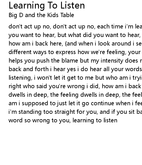 don't act up no, don't act up no, each time i'm learning to listen, but what did you want to hear, but what did you want to hear, self minded you deny you fear, how am i back here, {and when i look around i see we're all the same, yet different ways to express how we're feeling, your silence keeps you in line helps you push the blame but my intensity does not deserve any guilt or shame} back and forth i hear yes i do hear all your words but my question is are you listening, i won't let it get to me but who am i trying to kid, what's right is right who said you're wrong i did, how am i back here (repeat), the feeling dwells in deep, the feeling dwells in deep, the feeling dwells in, {chorus} now am i supposed to just let it go continue when i feel it's wrong, i'm standing i'm standing too straight for you, and if you sit back that's fine but why is my word so wrong to you, learning to listen |