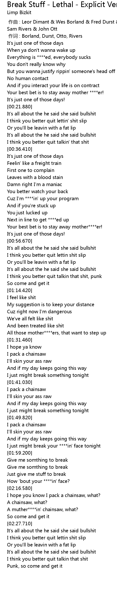 | [00:00.00] | 作曲 : Leor Dimant & Wes Borland & Fred Durst & Brendan O`Brien & Sam Rivers & John Ott |