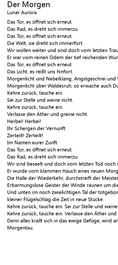 | Morgenlicht und Nebelklang, Angstgeschrei und Werdegang. | |
