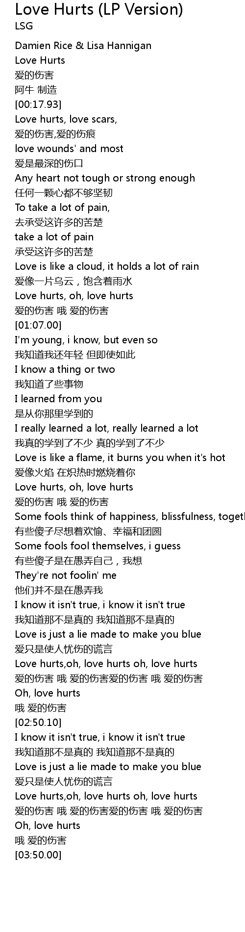 | [03:26.20] | Love hurts, oh, love hurts oh, love hurts |
