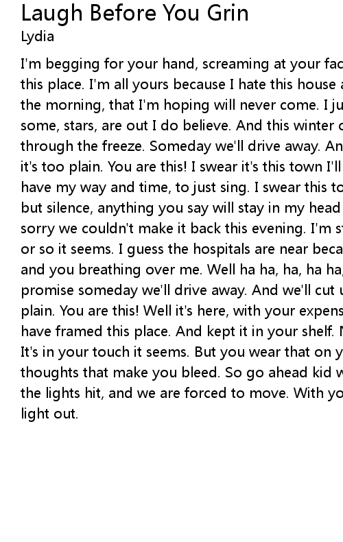 I'm begging for your hand, screaming at your face. Come with me kid we'll leave this place. I'm all yours because I hate this house and how sad it makes you in the morning, that I'm hoping will never come. I just want to watch this sky and some, stars, are out I do believe. And this winter came I think we made it through the freeze. Someday we'll drive away. And we'll cut up my face because it's too plain. You are this! I swear it's this town I'll never see again. If I have my way and time, to just sing. I swear this town I will not see. Anything but silence, anything you say will stay in my head for days and days. But I'm sorry we couldn't make it back this evening. I'm still hoping. We have to move or so it seems. I guess the hospitals are near because I can hear those screams, and you breathing over me. Well ha ha, ha, ha ha, I tricked you once again but I promise someday we'll drive away. And we'll cut up my face because it's too plain. You are this! Well it's here, with your expensive taste that we should have framed this place. And kept it in your shelf. Next to you big city dreams. It's in your touch it seems. But you wear that on your sleeve, and all the thoughts that make you bleed. So go ahead kid we loved it. Sing it loud before the lights hit, and we are forced to move. With your window up we can keep the light out. |