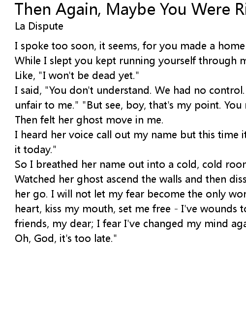 Watched her ghost ascend the walls and then dissolve, "This time I choose to let her go. I will not let my fear become the only world I've ever known. I know my heart, kiss my mouth, set me free - I've wounds to mend. And we'll be more than friends, my dear; I fear I've changed my mind again." "But boy, you're too late. Oh, God, it's too late." |