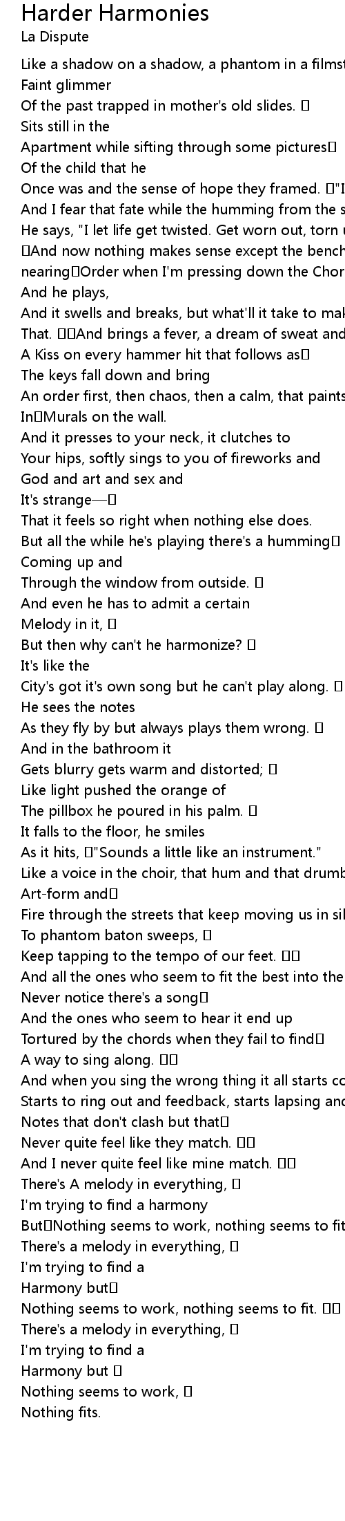 | He says, " I let life get twisted. Get worn out, torn up, and Late with the rent. And now nothing makes sense except the bench and That piano. A feeling nearing Order when I' m pressing down the Chords." | |