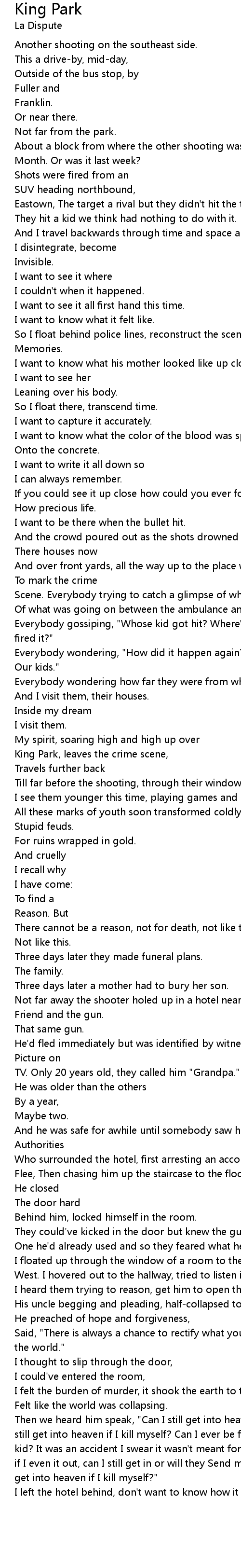 Then we heard him speak, "Can I still get into heaven if I kill myself? Can I still get into heaven if I kill myself? Can I ever be forgiven cuz I killed that kid? It was an accident I swear it wasn't meant for him! And if I turn it on me, if I even it out, can I still get in or will they Send me to hell? Can I still get into heaven if I kill myself?" |
