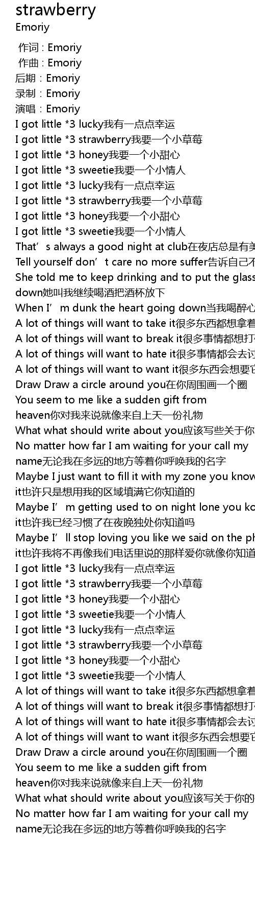 | [01:35.000] | I got little 3 strawberry wo yao yi ge xiao cao mei |