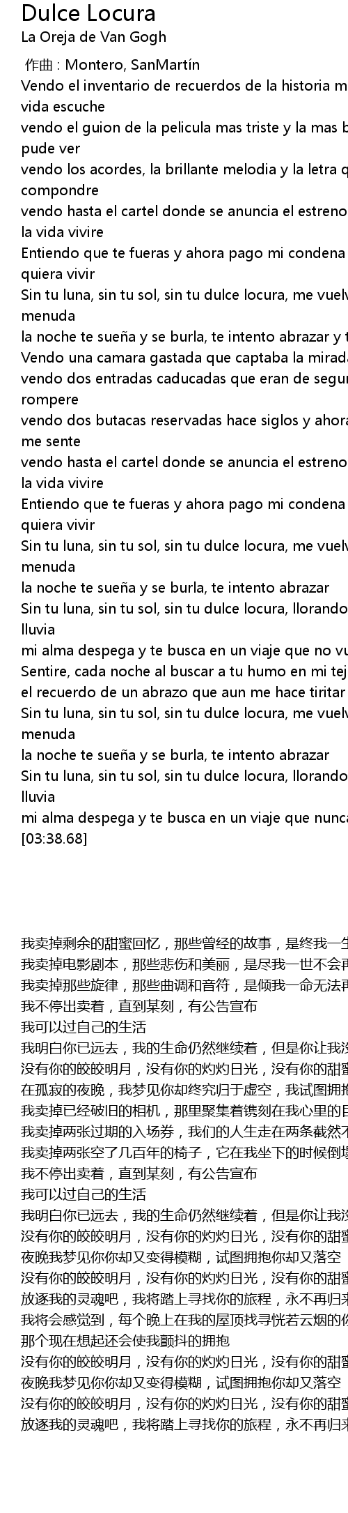 | [03:17.74] | Sin tu luna, sin tu sol, sin tu dulce locura, llorando como un dia de lluvia |