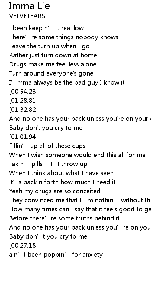 | [01:42.61][00:27.18][00:47.72][01:22.18] | I’mma lie to the world and say I ain’t been poppin’ for anxiety |