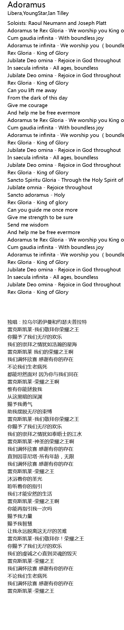 | [03:17.05] | Adoramus te Rex Gloria We worship you King of Glory |