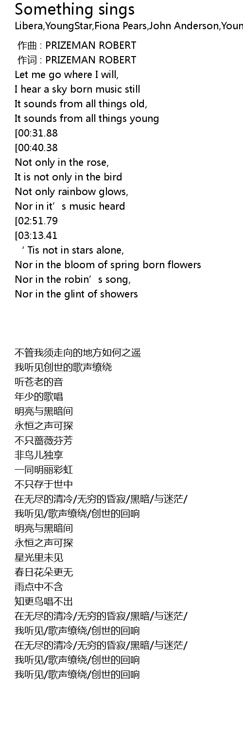 | [03:26.76][03:13.41][03:00.66][01:25.85] | There always, always something sings |