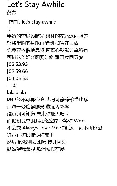 | [03:27.37][03:05.58][01:52.78][01:01.91] | Let' s Stay Awhile lái shēn shēn qīn duō yī wěn |