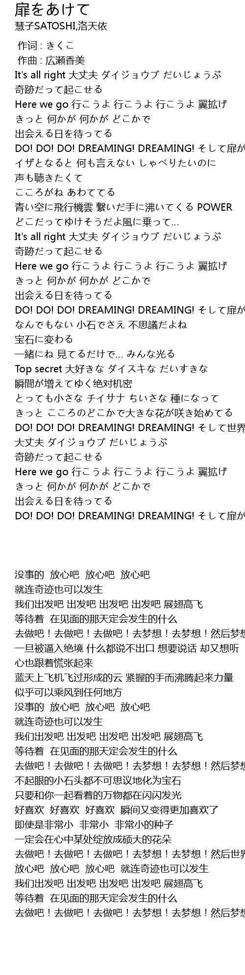 | [04:01.99] | DO! DO! DO! DREAMING! DREAMING! そして扉がひらくよ… |