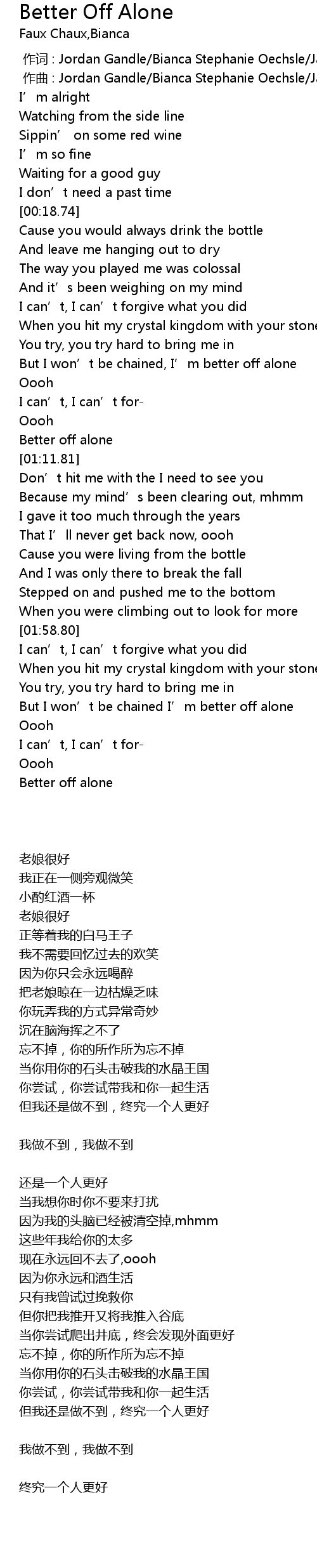 | [00:46.94] | But I won' t be chained, I' m better off alone |