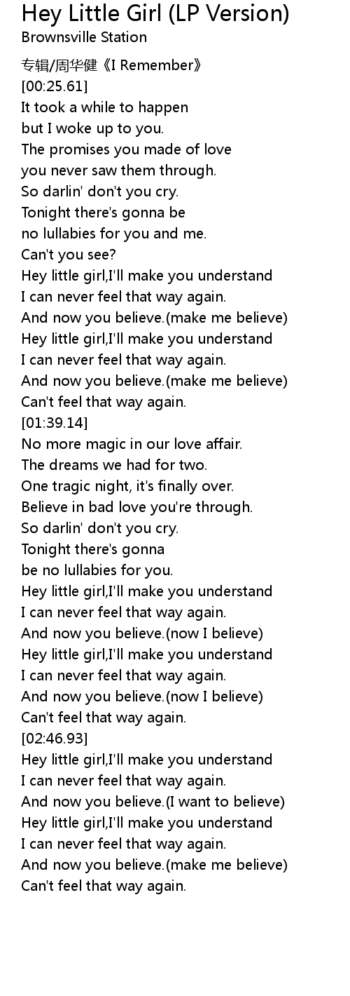 | [03:01.79] | Hey little girl,I'll make you understand |