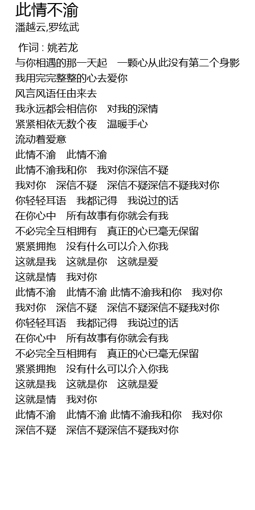 | [00:56.89] | 此情不渝 此情不渝 此情不渝我和你 我对你深信不疑 |