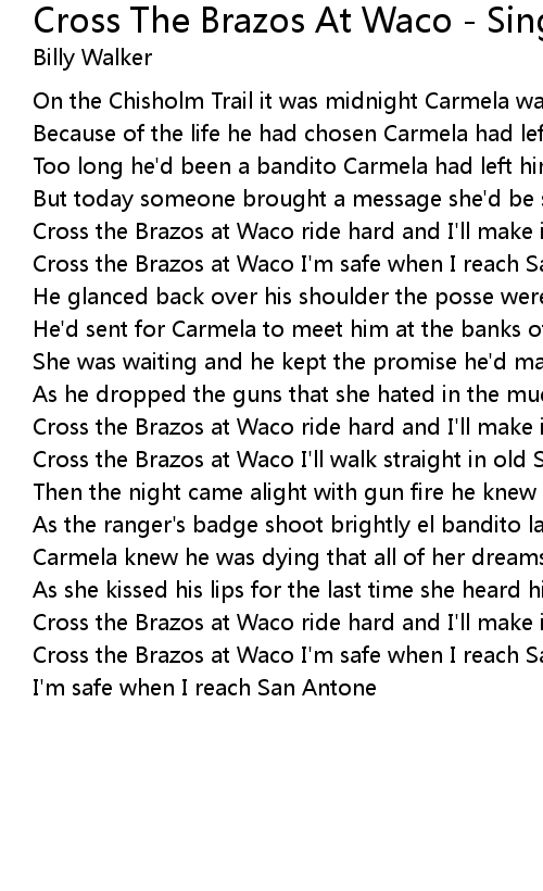 Cross the Brazos at Waco I'm safe when I reach San Antone |
