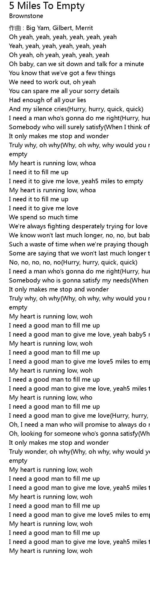 | I need a good man to give me love, yeah baby5 miles to empty | |