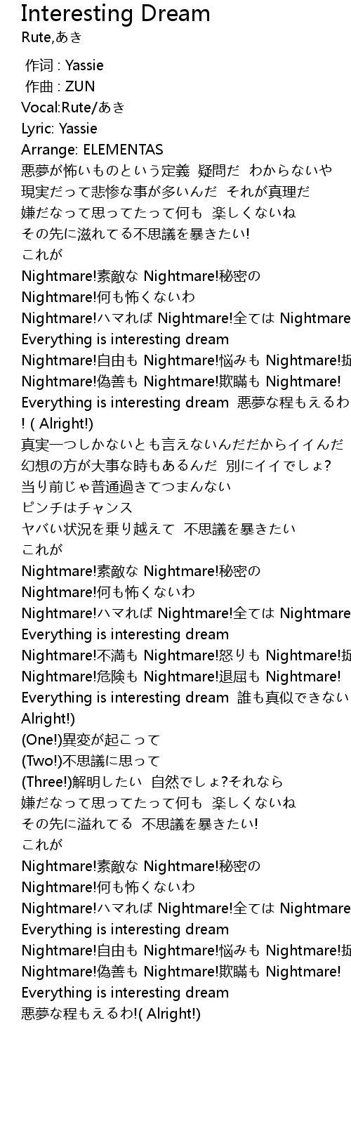 | [01:23.06] | Everything is interesting dream 悪夢な程もえるわ !(Alright!) |
