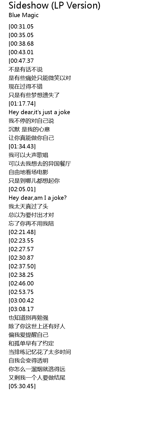 | [03:55.33][00:31.05] | Hey dear, it' s just a joke |