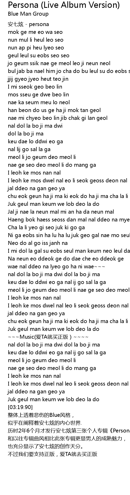 | [03:35.90] | 历时2年6个月才发行安七炫第三张个人专辑《Persona》。 |