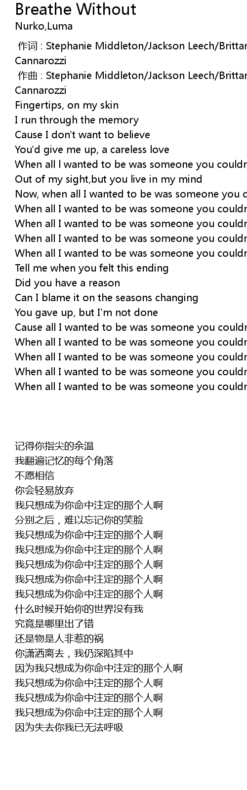 | [02:45.977] | When all I wanted to be was someone you couldn' t breathe without |