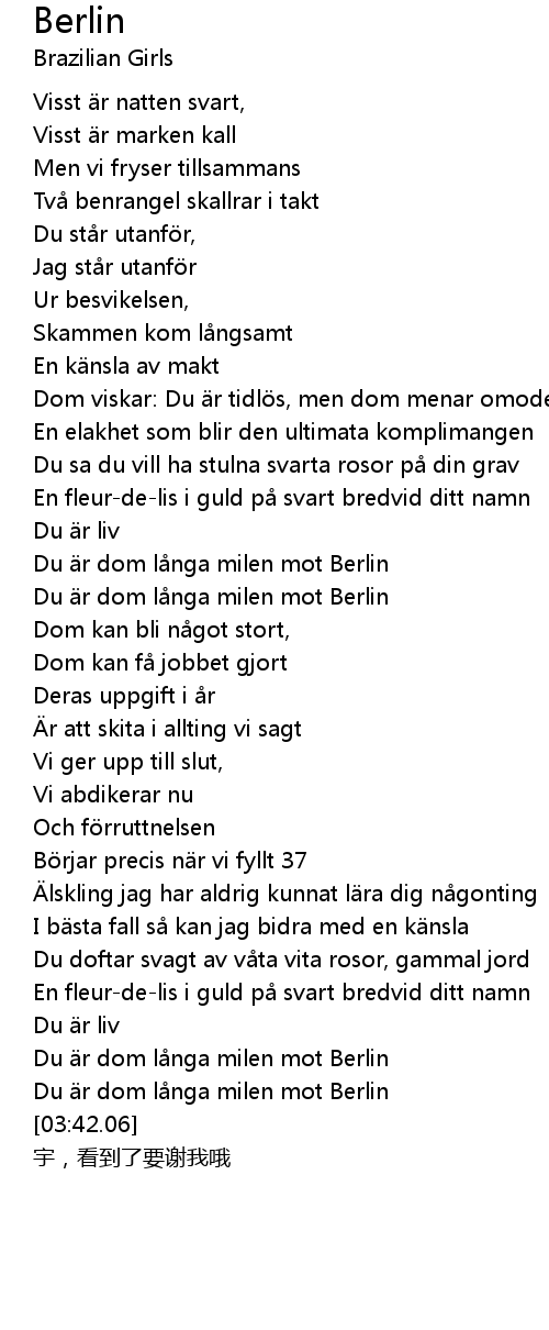 | [03:26.74] | Du är dom långa milen mot Berlin |