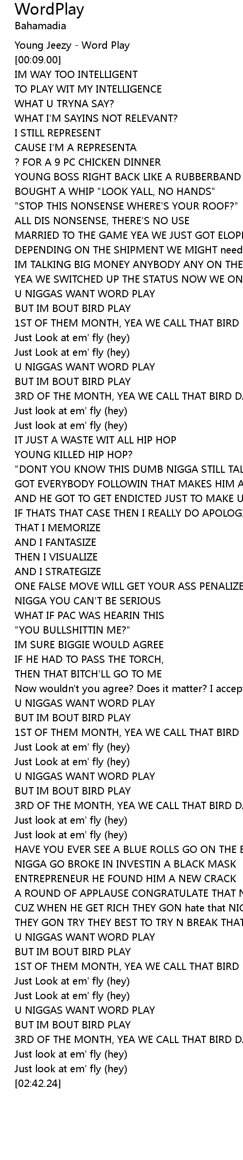 | [02:33.25] | BUT IM BOUT BIRD PLAY |