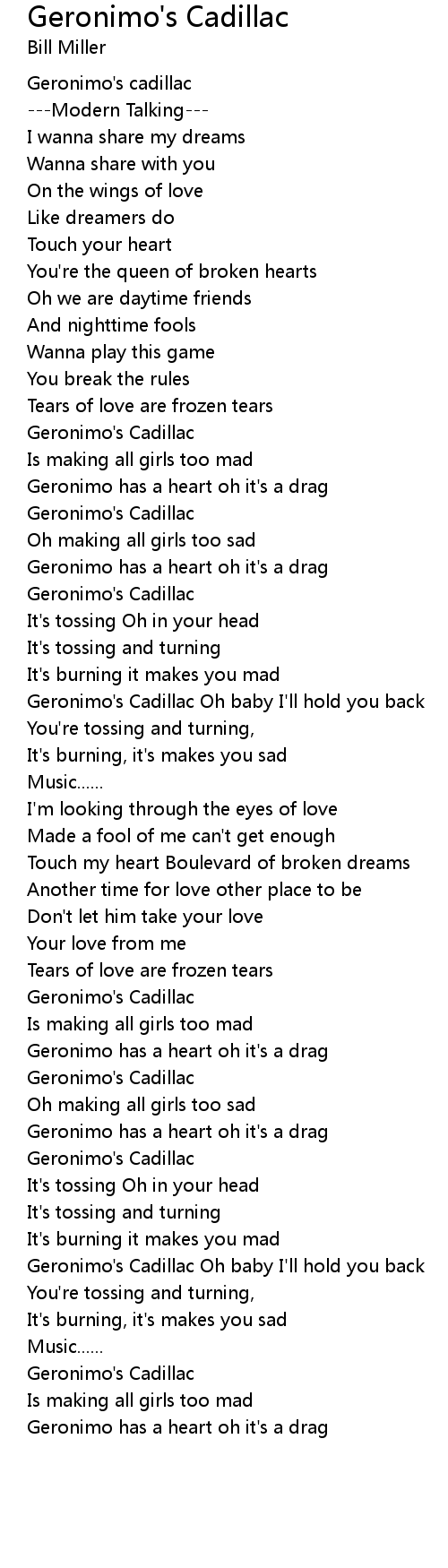 Geronimo's Cadillac Oh baby I'll hold you back |
