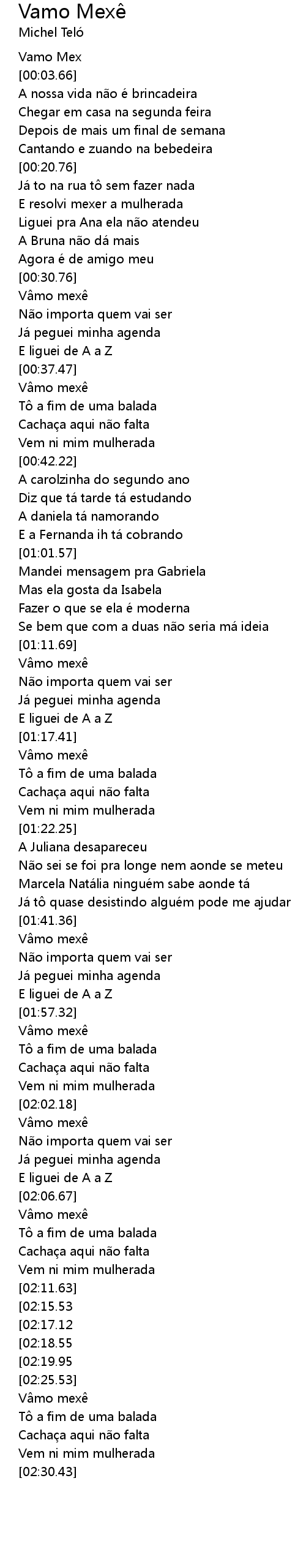 | [02:19.97][02:15.53][02:12.07] | Vâmo mexê |
