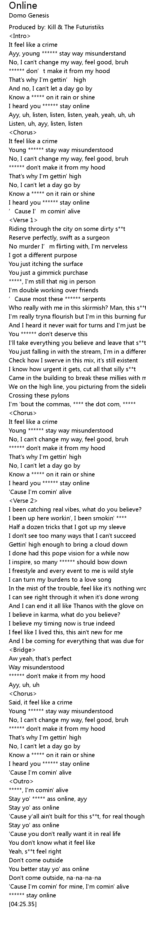 | [01:02.35] | I heard you ****** stay online |
