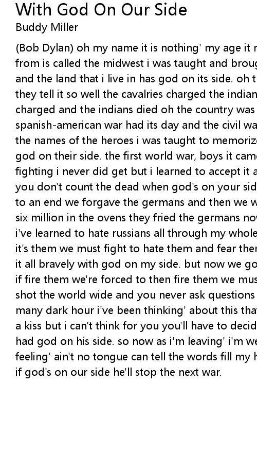 (Bob Dylan) oh my name it is nothing' my age it means less the country i come from is called the midwest i was taught and brought up there the laws to abide and the land that i live in has god on its side. oh the history books tell it they tell it so well the cavalries charged the indians fell the cavalries charged and the indians died oh the country was young with god on its side. the spanish-american war had its day and the civil war too was soon laid away and the names of the heroes i was taught to memorize with guns in their hands and god on their side. the first world war, boys it came and it went the reason for fighting i never did get but i learned to accept it and accept it with pride or you don't count the dead when god's on your side. when the second world war came to an end we forgave the germans and then we were friends though they murdered six million in the ovens they fried the germans now too have god on their side. i've learned to hate russians all through my whole life if another war comes it's them we must fight to hate them and fear them to run and to hide and accept it all bravely with god on my side. but now we got weapons of the chemical dust if fire them we're forced to then fire them we must one push of the button and a shot the world wide and you never ask questions when god's on your side. in a many dark hour i've been thinking' about this that jesus christ was betrayed by a kiss but i can't think for you you'll have to decide whether judas iscariot had god on his side. so now as i'm leaving' i'm weary as hell the confusion i'm feeling' ain't no tongue can tell the words fill my head and fall to the floor if god's on our side he'll stop the next war. |