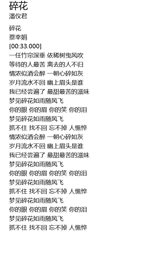 | [03:00.330] | meng jian sui hua ru yu sui feng fei |