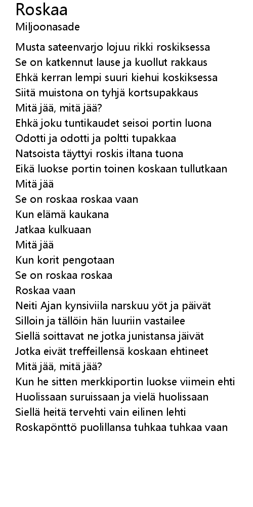 | Roskap ntt puolillansa tuhkaa tuhkaa vaan |