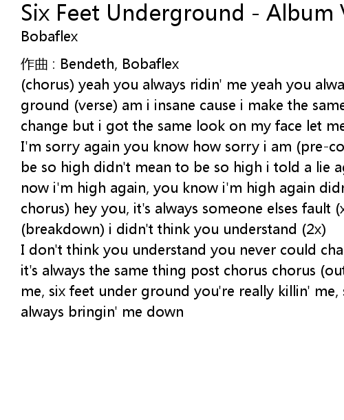 | I don' t think you understand you never could change me you never could make me it' s always the same thing post chorus chorus outro 2x you' re always drivin' me, six feet under ground you' re really killin' me, six feet underground you' re always bringin' me down |