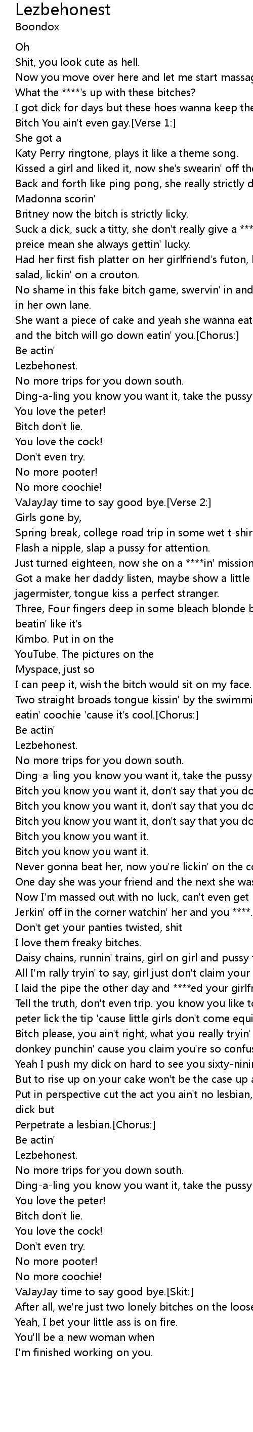 Two straight broads tongue kissin' by the swimmin' pool, fake dyke bitches eatin' coochie 'cause it's cool.[Chorus:] |