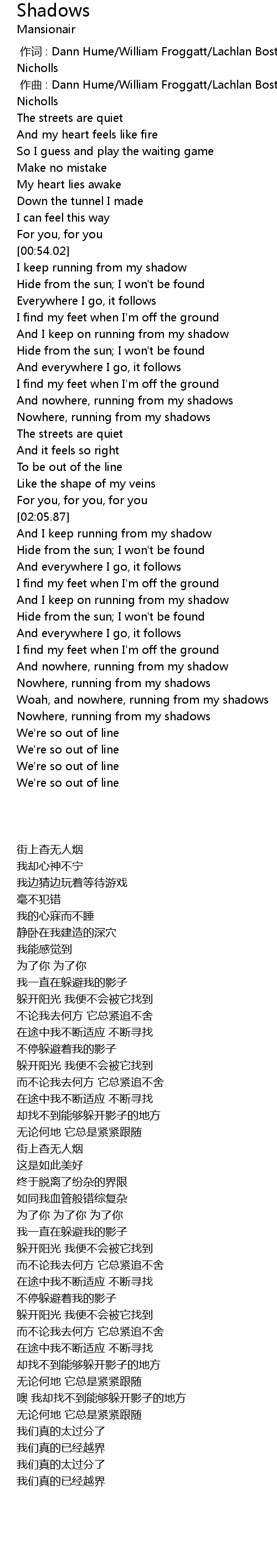 | [02:43.34] | Woah, and nowhere, running from my shadows |