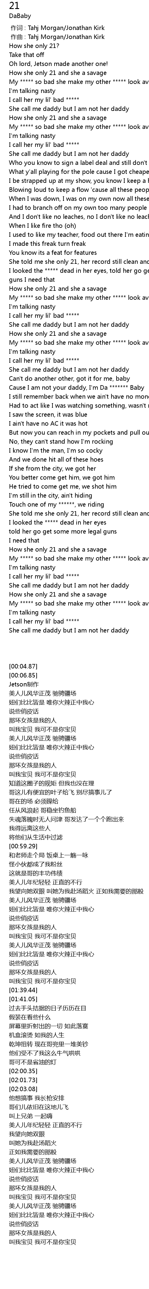 | [01:27.50] | How she only 21 and she a savage |