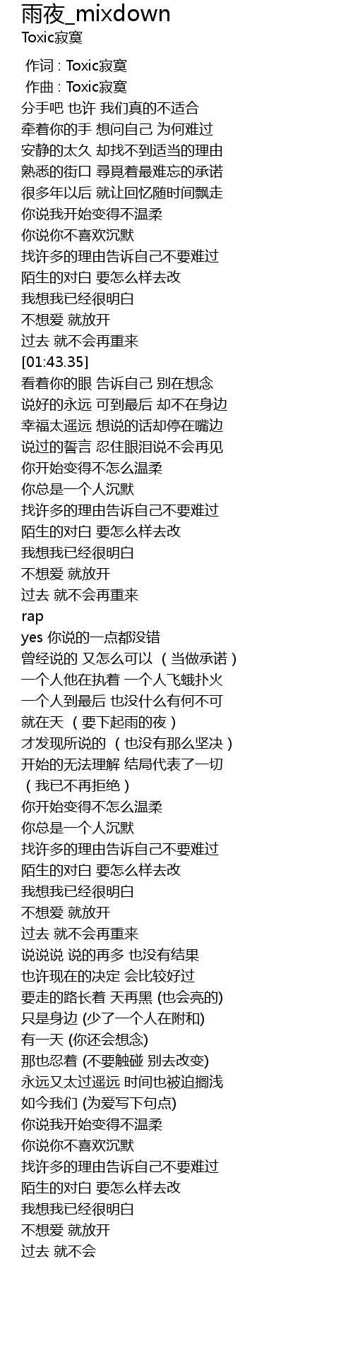 | [00:00.000] | 作词 : Toxic寂寞 |